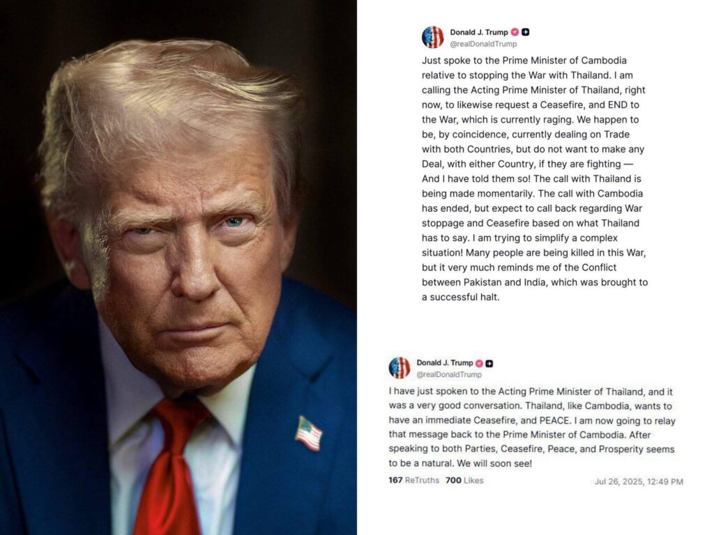 Just spoke to the Prime Minister of Cambodia relative to stopping the War with Thailand. I am calling the Acting Prime Minister of Thailand, right now, to likewise request a Ceasefire, and END to the War, which is currently raging. We happen to be, by coincidence, currently dealing on Trade with both Countries, but do not want to make any Deal, with either Country, if they are fighting And I have told them so! The call with Thailand is being made momentarily. The call with Cambodia has ended, but expect to call back regarding War stoppage and Ceasefire based on what Thailand has to say. I am trying to simplify a complex situation! Many people are being killed in this War, but it very much reminds me of the Conflict between Pakistan and India, which was brought to a successful halt.